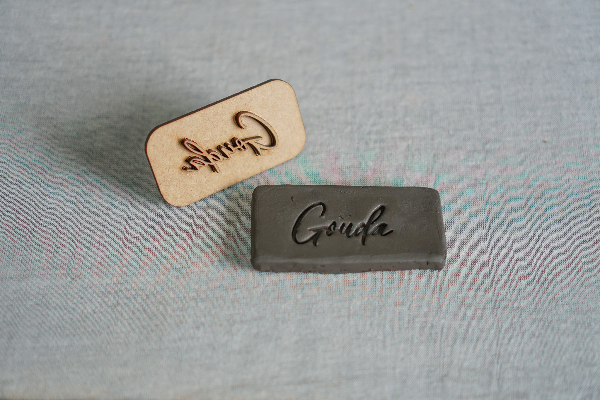 Carimbo em MDF com Pegador Auxiliar - Palavra "GOUDA"