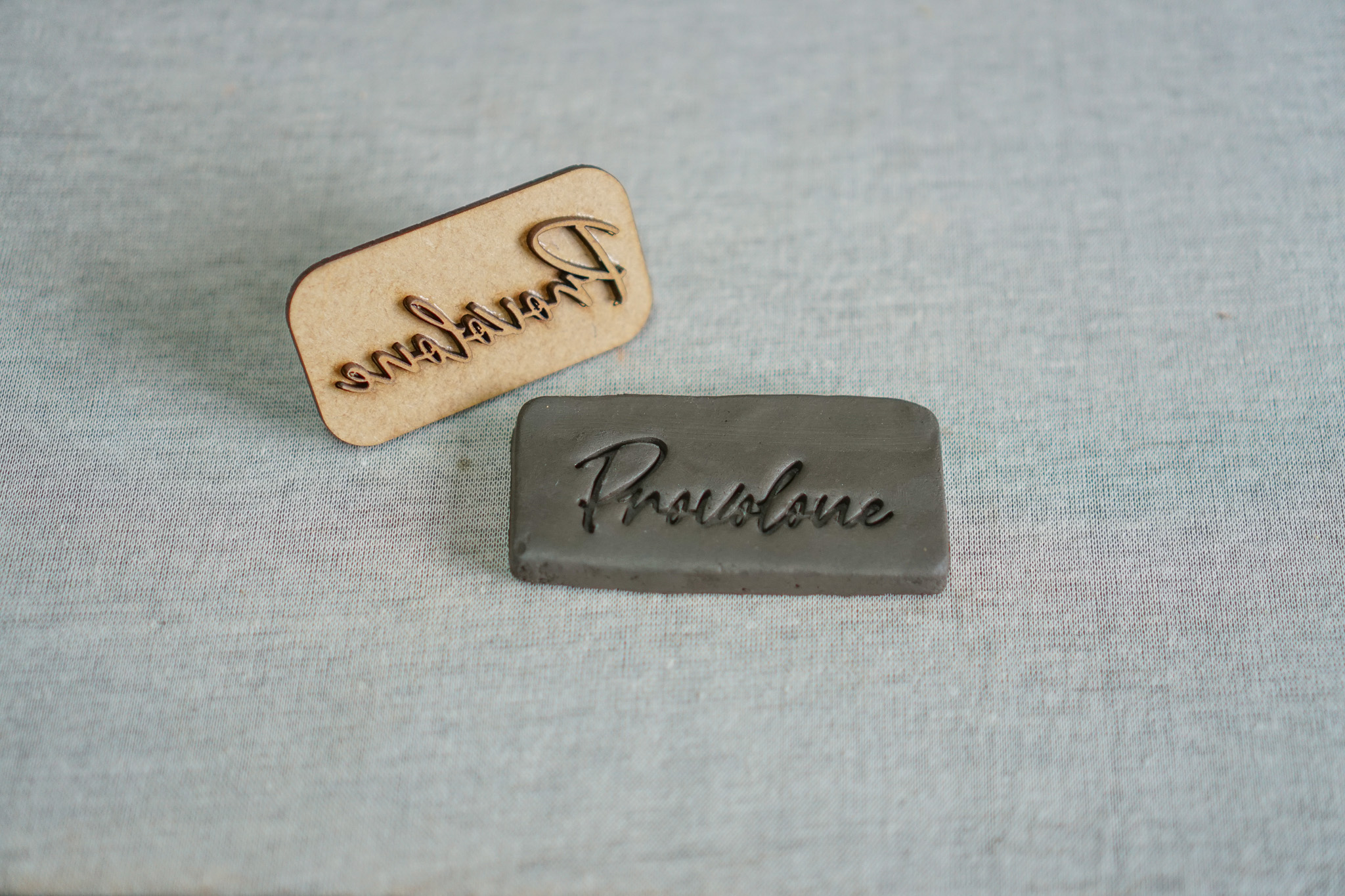 Este carimbo em MDF, com a palavra "PROVOLONE", é perfeito para adicionar um toque personalizado e encantador aos seus projetos.