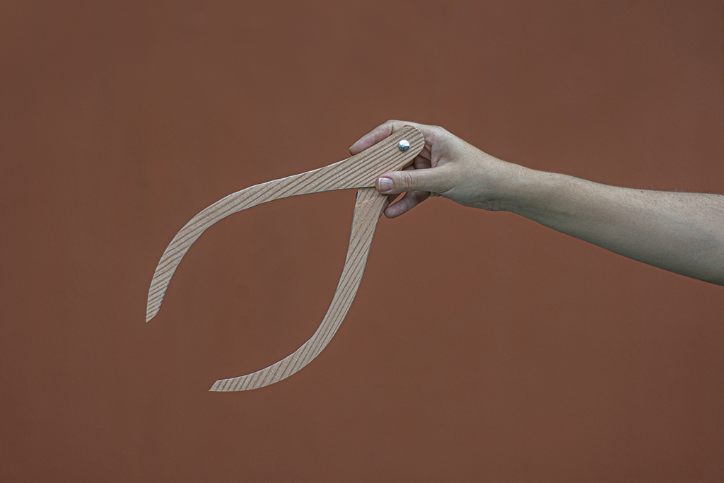 Compasso de medida para transferência e torno, confeccionado em madeira com parafuso de metal.