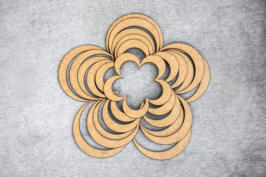 Guias de corte concêntricas em formato de flor feitas em MDF 3mm, com 6 tamanhos diferentes.