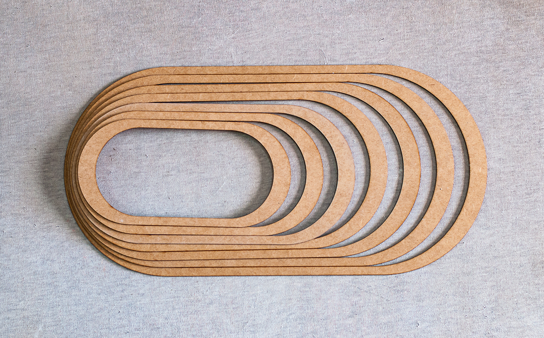 Guias de corte concêntricas em formato de oblongo feitas em MDF 3mm, com 7 tamanhos diferentes.