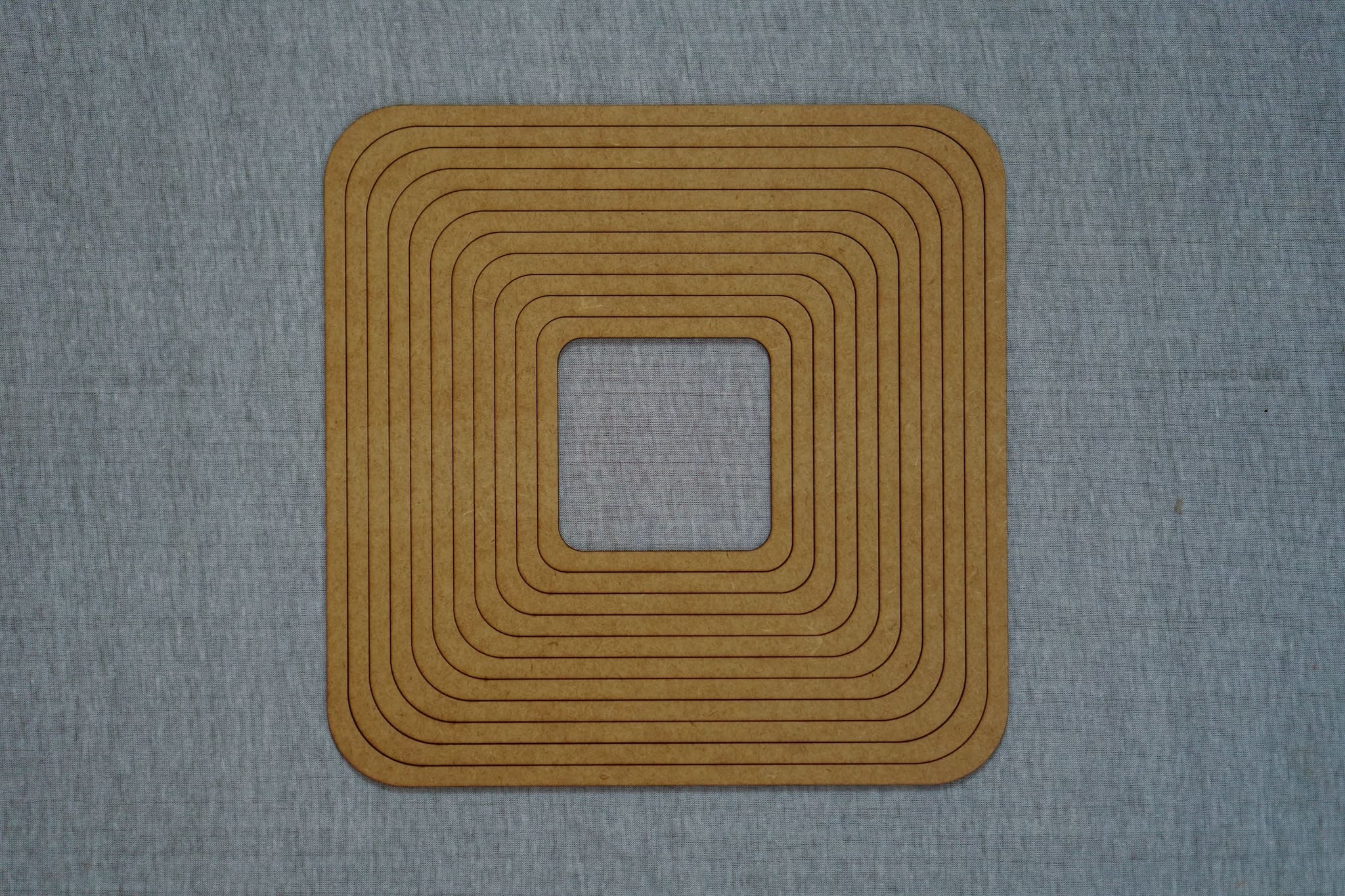 Guias de corte concêntricas em formato quadrado com cantos arredondados feitas em MDF 3mm, com 11 tamanhos diferentes.