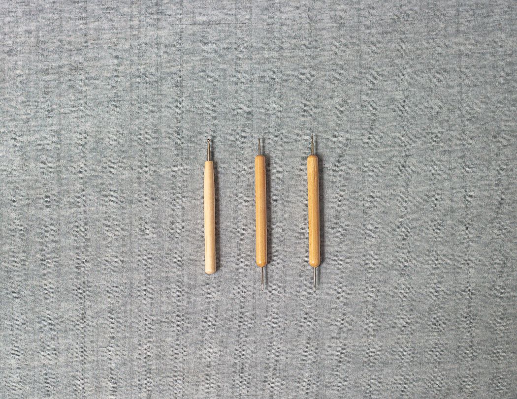 Este kit é composto por 3 ferramentas de madeira com pontas boleadoras de metal em diferentes tamanhos.