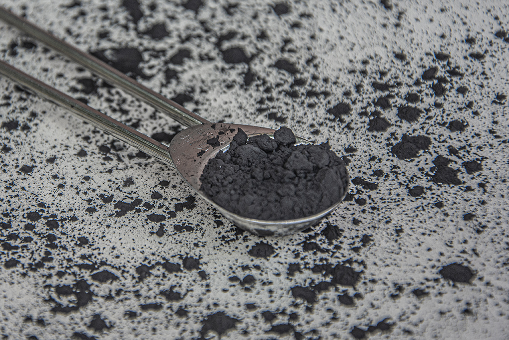 Mineral colorante, de pó preto, que produz tons de verde e turquesa.