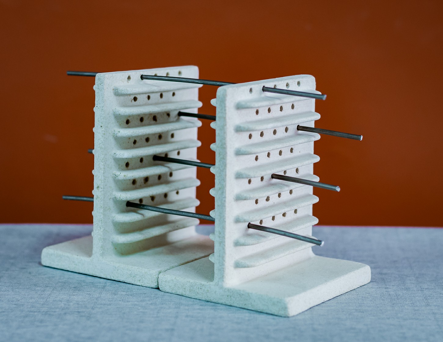 Par de suportes refratários com 31 furos cada, feitos de cordierita, para queima de bijuterias.