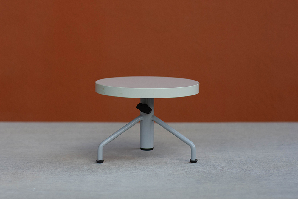 Torno giratório com tripé de metal e tampo em fórmica, o que oferece resistência e muita praticidade na hora de lavar.
